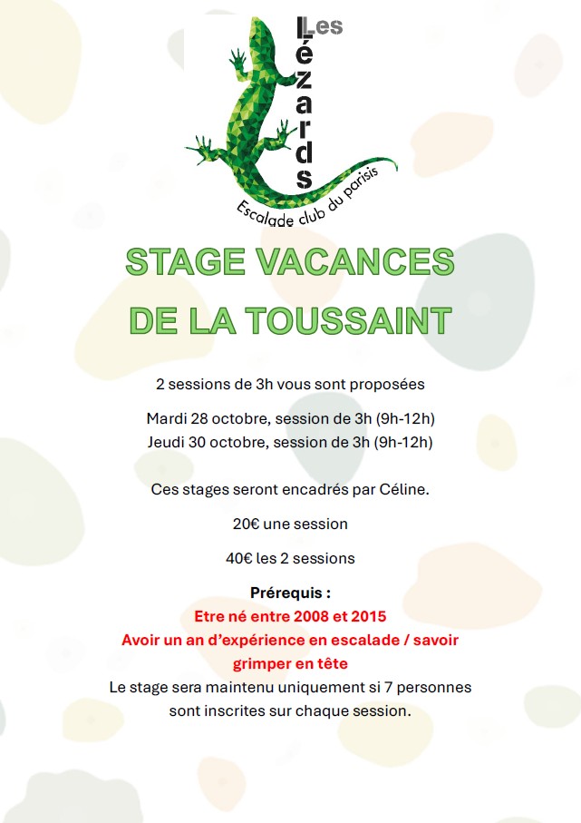 Cette année le club vous propose un stage pendant les vacances de la toussaint. Vous pouvez télécharger le flyer içi.